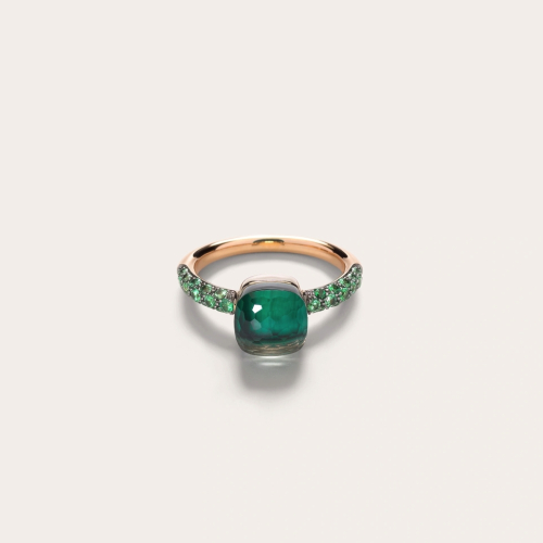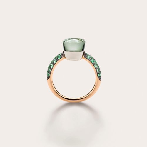 Кольцо из 18-каратного розового и белого золота с 1 празиолитом и малахитом (≈4,9 карата) и 32 цаворитами (≈0,5 карата) на 18-каратном розовом золоте с черным родиевым покрытием.