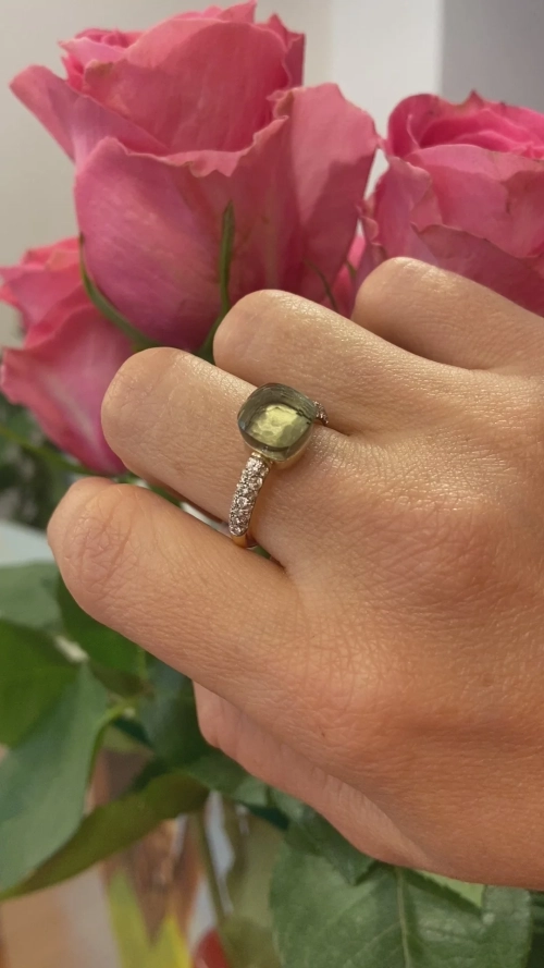 Кольцо из 18-каратного розового и белого золота с 1 празиолитом (≈7 кар) и 58 белыми бриллиантами (≈0,7 карат) на 18-каратном розовом золоте с белым родиевым покрытием.