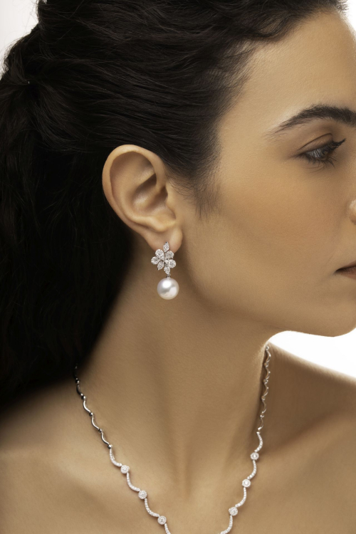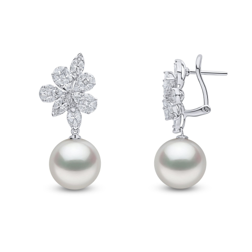 Эти изысканные серьги из белого золота украшены светящимися жемчужинами, изящно подвешенными под ослепительными цветочными мотивами из бриллиантов. Идеальное сочетание элегантности и блеска, они излучают вневременную изысканность, что делает их очаровательным дополнением к любой коллекции ювелирных украшений.