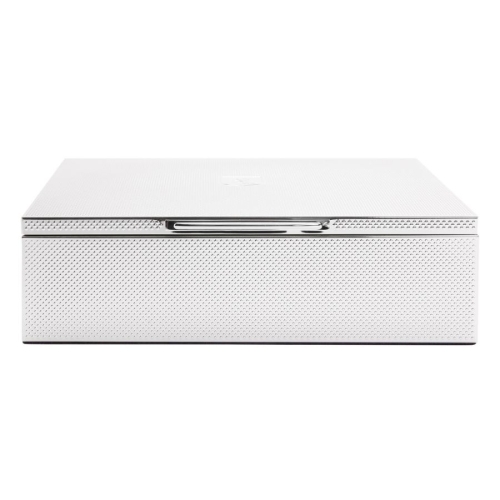 Шкатулка Silver для часов и украшений Legacy вдохновлена серебряными шкатулками Филиппа Вольфа I, созданными в Ханау, Германия. Модель выполнена с серебряным покрытием и гильошированным узором, оснащена скрытой крышкой на рояльной петле и отделана внутри глубоким синим ультразамшем Ultrasuede с технологией LusterLoc™, предотвращающей потускнение украшений.