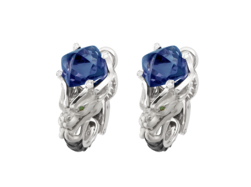 Серьги GUARDIAN из 18KT белого золота с белыми бриллиантами, изумрудами и аметистами.